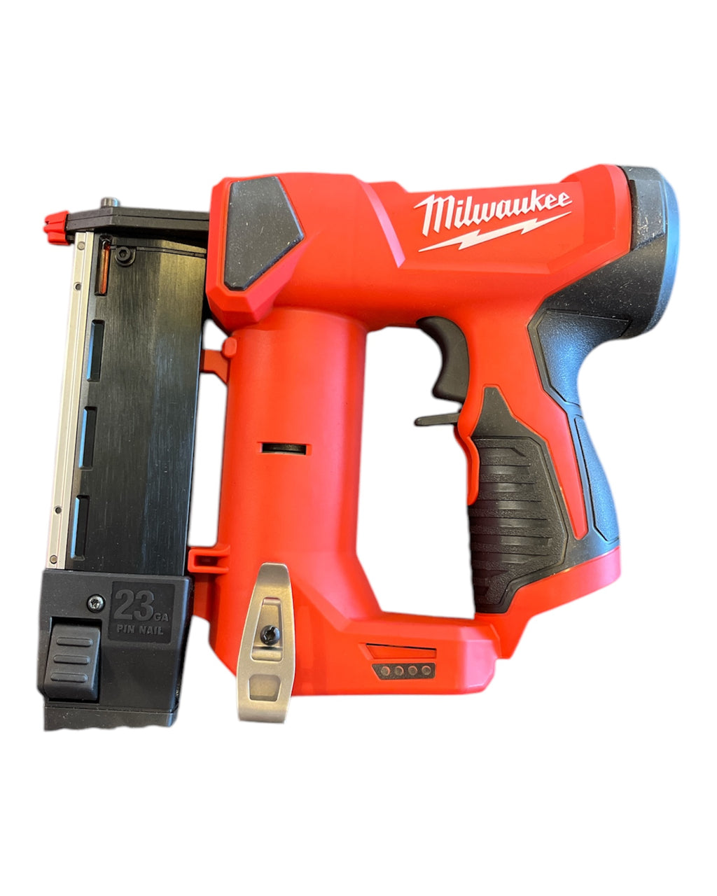 The MILWAUKEE M12 23 Gauge Pin Nailer is the most compact cordless pin nailer, combining precision and power to deliver the performance that professional carpenters and remodelers demand, without the hassle of a compressor hose or gas cartridge. The 23 gauge pin nailer provides users with unmatched productivity and accessibility in tight spaces and confined corners with a lightweight, ergonomic design. The nitrogen air spring mechanism allows the nailer to consistently sink pin nails at proper depth into hard or softwoods while leaving small, clean nail holes. The double-action trigger and non-marring precision point tip allow users to perform sequential driving and accurate pin placement into delicate trim pieces. The dry-fire lockout feature prevents misfires and workpiece damage. The M12 Pin Nailer drives 23-gauge headless pin nails ranging in length from 1/2" to 1-3/8" and features all-day run time with up to 750 pin nails per charge when paired with an M12 REDLITHIUM CP1.5 battery pack. This battery-powered pin nailer also features a magazine reload indicator, tool-free drive depth adjustment, reversible belt clip, LED light, battery fuel gauge, secondary work contact tip, and carries an industry-leading 5-year limited power tool warranty.